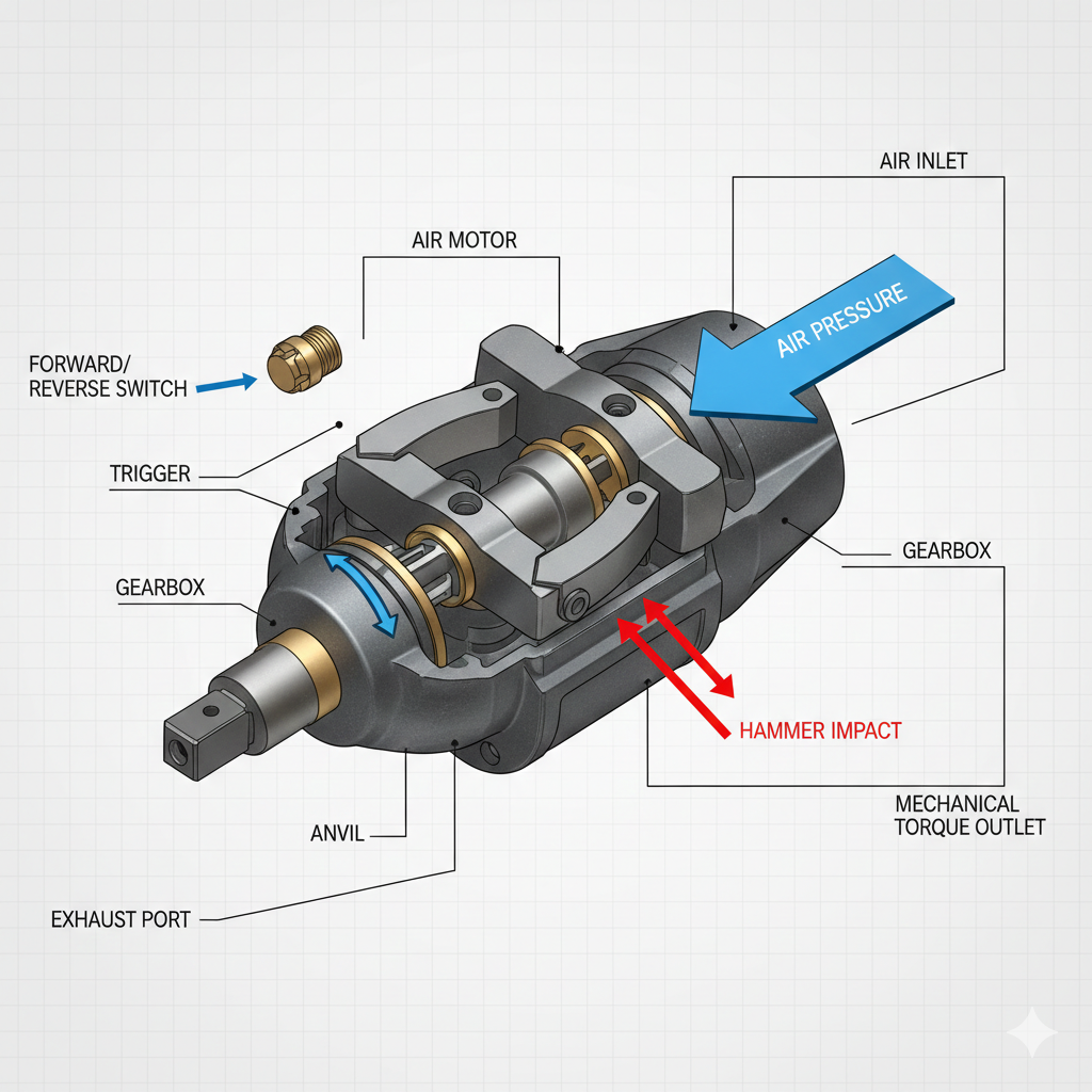 হৃদয় a বায়ুসংক্রান্ত প্রভাব রেঞ্চ এর এয়ার মোটর। যখন ব্যবহারকারী ট্রিগার টানে, সংকুচিত বায়ু টুলে প্রবেশ করে এবং একটি রটার ঘোরায়। এই রটার একটি "ইমপ্যাক্ট মেকানিজম"-এর সাথে সংযুক্ত থাকে - সাধারণত একটি টুইন-হামার বা রকিং-ডগ ডিজাইন। রটার ঘোরার সাথে সাথে এটি গতিশক্তি তৈরি করে। যখন বোল্টের প্রতিরোধ ক্ষমতা মোটরের ঘূর্ণন শক্তির চেয়ে বেশি হয়ে যায়, তখন অভ্যন্তরীণ হাতুড়িগুলি আউটপুট শ্যাফ্টে (অ্যাভিল) আঘাত করে, হঠাৎ করে ঘূর্ণন শক্তির ব্যাপক বিস্ফোরণ ঘটায়। এটি প্রতি মিনিটে শত শত বা এমনকি হাজার হাজার বার ঘটে।